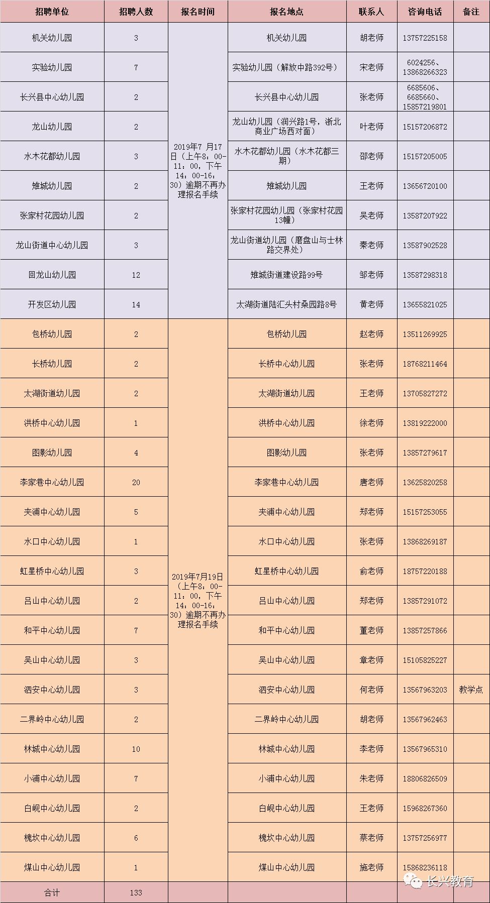 2.报名时间和地点详见《长兴县教育局下属幼儿园招聘编外幼儿教师招考计划表》。