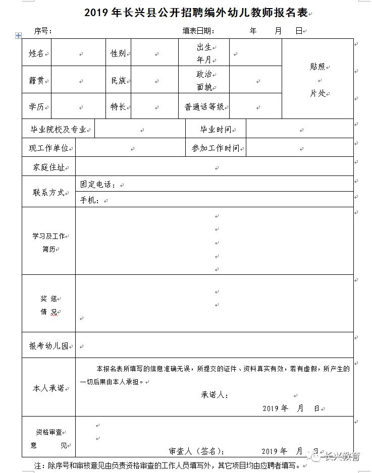 《2019年长兴县公开招聘编外幼儿教师报名表》1份;个人简历、身份证、毕业证书、幼儿园教师资格证书、普通话等级证书原件及复印件各1份。